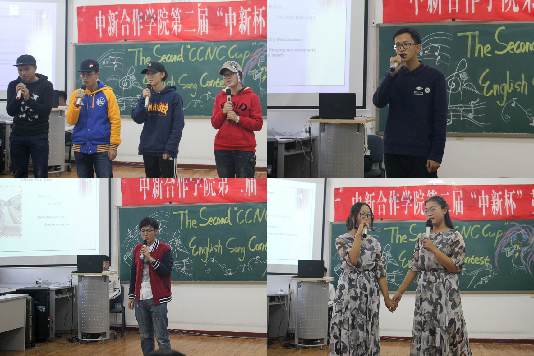 比赛的主持、歌唱、点评等环节全部使用英语,每组选手都使出浑身解数演绎了不同风格的英文歌曲,参赛节目形式多样、精彩连连:《My Heart Will Go On》及《Dying In The Sun》两首歌曲清新脱俗,温暖空灵,引起观众的共鸣;《We Don’t Talk Anymore》低沉伤感,令人内心宁静,回味无限;《Auld Lang Syne》在口琴伴奏声中,以其感人的曲调和淡淡地思念之情将现场渲染的伤感而充满温情,深深感染了在场的每一位观众;节奏轻快的《It’s My Life》及《Something just like this》贴近生活,让人耳目一新;《Because of you》以其独特的创意博得阵阵掌声;《There for you》有动感和独特的节奏 ,《We will rock you》将比赛推向高潮。现场欢呼声、尖叫声、掌声此起彼伏。