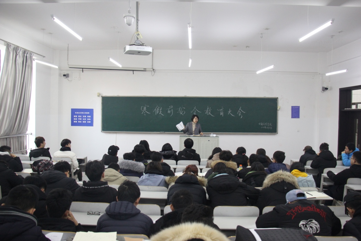 会上,辅导员传达了公司《关于做好2019年元旦及寒假期间相关员工工作》的通知,提醒同学们在离校前对宿舍安全、水电安全进行检查与确认,在寒假假期中注意个人的人身安全、财物安全、出行交通安全、饮食安全等,不参与邪教组织级活动、不参与法轮功组织及活动、不参与传销组织及活动,不借校园不良贷款。假期多读书、读好书,寒假结束后按时返校注册。