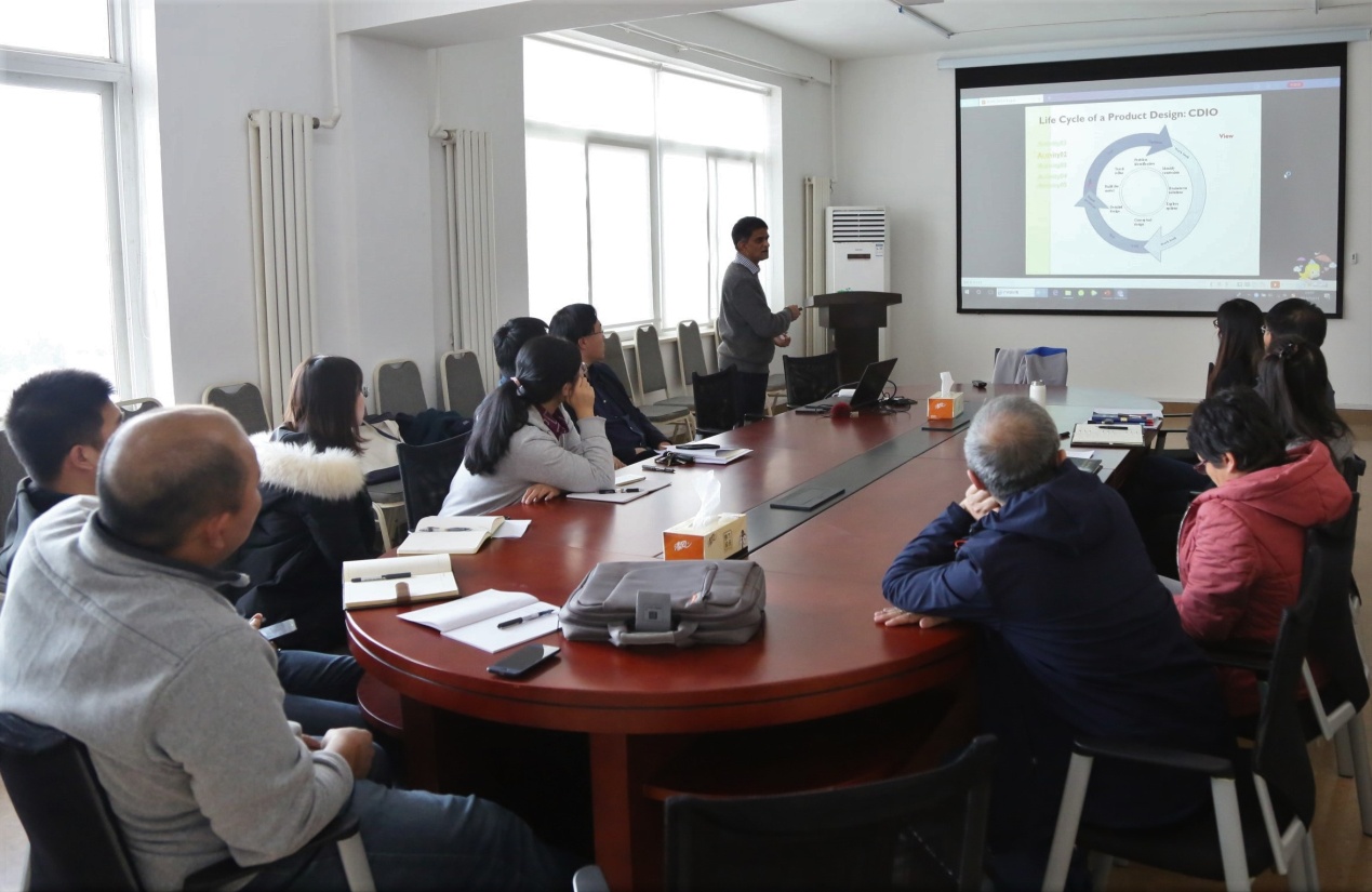 在本次沙龙中,外籍教师Avinda Weerakoon作了题为Integrating Experiential Engineering Tasks in the Second Language Medium Programmes的演讲,以他在中外合作办学项目讲授的课程为例,结合课程照片及视频,生动细致地讲解了如何基于CDIO工程教育模式,进行以员工为主体的项目式教学。