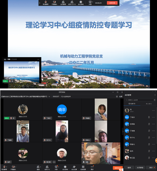 2022年5月3日,机械与动力工程公司党总支理论学习中心组在钉钉线上平台开展疫情防控专题学习。公司党总支理论学习中心组成员、各党支部书记参加会议,本次学习由党总支书记高巍同志领学。