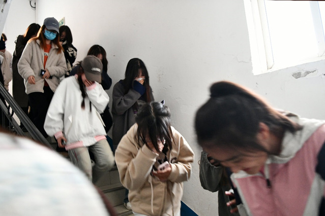 演练开始前,沙河口区消防救援大队教官对参加演练的同学进行消防疏散逃生技巧、逃生路线及注意事项等方面培训。随后,现场工作人员模拟火情,制造烟气效果、拉响警报,并通过消防应急广播组织疏散,所有参演员工弯腰低头、迅速、有序地从宿舍楼撤离到指定集合地点,整个疏散过程紧张有序。疏散结束后,消防队员带领员工参观消防车,详细讲解各类消防器材、救援装备,通过体验消防、认识消防,提高同学们的消防安全意识。