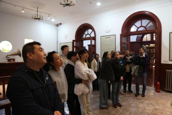活动中,师生们首先来到中苏友谊塔下,大家一边对照提前准备的资料,一边仔细观察现场环境,认真梳理日本侵华、日俄战争的历史脉络,深刻领会塔身所承载的中苏友谊与和平的深远意义。随后,师生们走进留声机博物馆。在馆内,大家纷纷驻足观赏各式各样的老留声机与唱片,并仔细聆听馆藏的音频片段。透过这些承载着时代记忆的老物件,大家仿佛串联起了近代社会的变迁与抗争岁月,深切感受到了中华民族不屈不挠的精神。